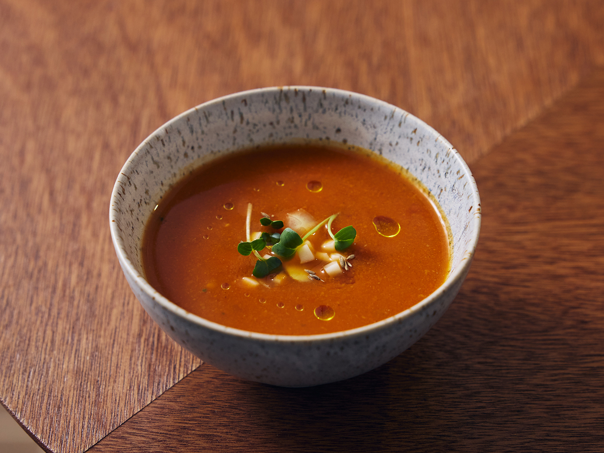 トマトの酸味と人参の甘み、にんにくと生姜で体をじんわり温める。リコピンたっぷり、食欲をそそるスパイススープ。